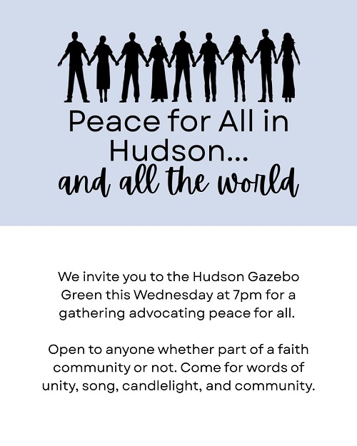 – Next Wednesday evening, at 7:00 pm, TBS and the First Congregational Church will hold a brief peace vigil at the Gazebo. We will be joined by a Hudson area chorus. Rev. Wiley and I will extend messages of love and compassion instead of hate.
